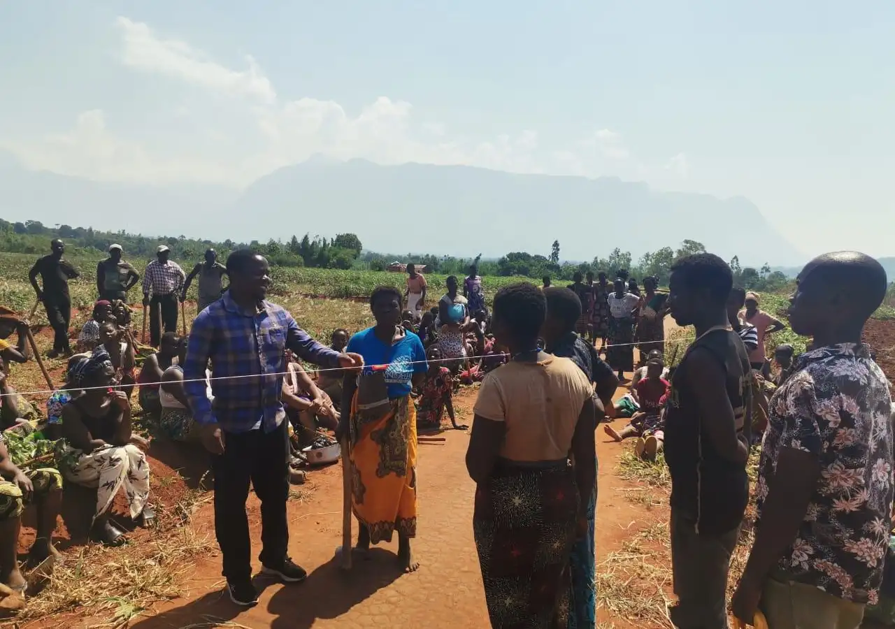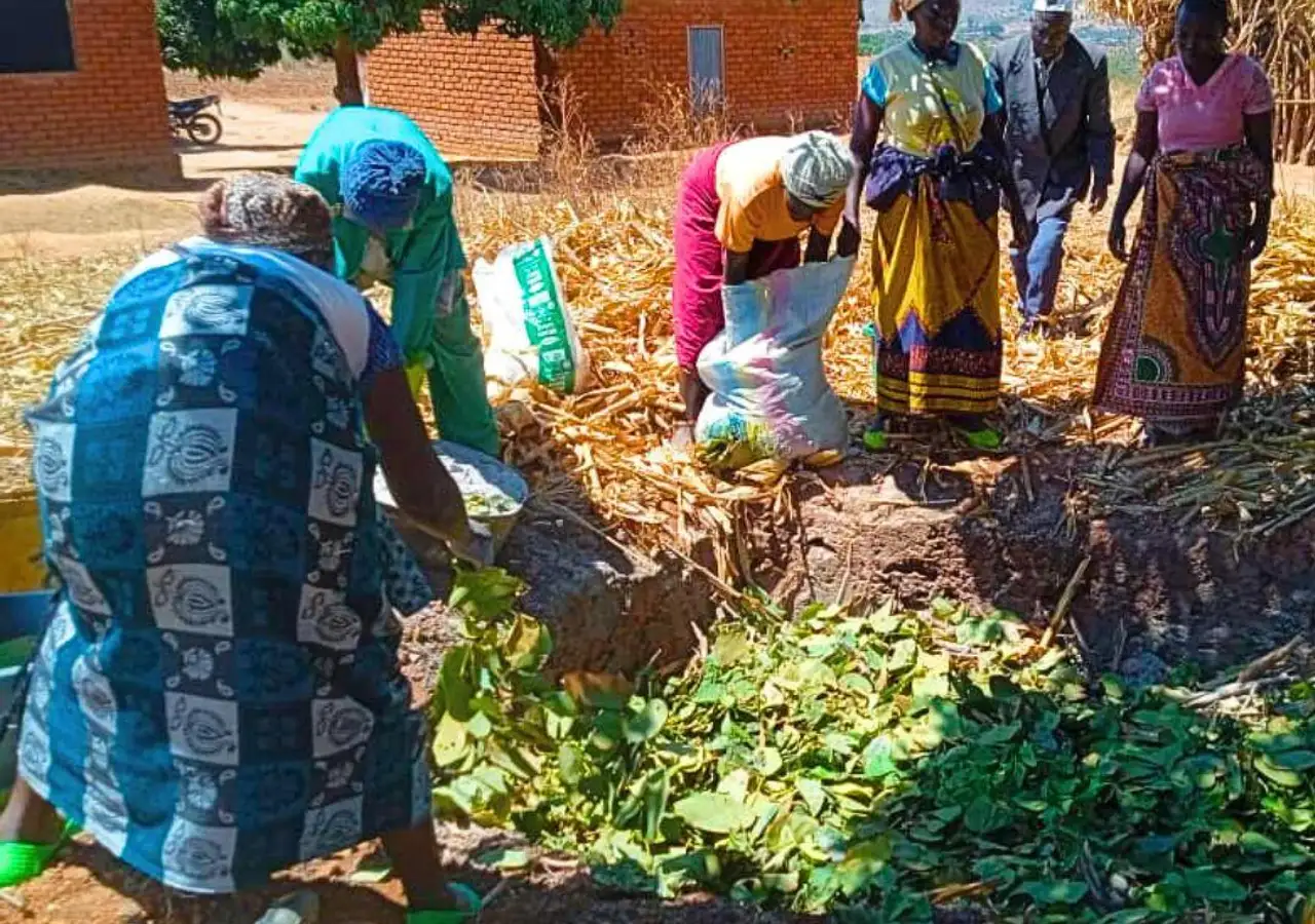 The final step involves training farmers in the adoption of climate-smart agriculture techniques, such as intercropping, mulching, use of organic manure and crop rotation. Tiyeni trains farmers to practise DBF in groups of around 20, so they can demonstrate the techniques to new adopters.
