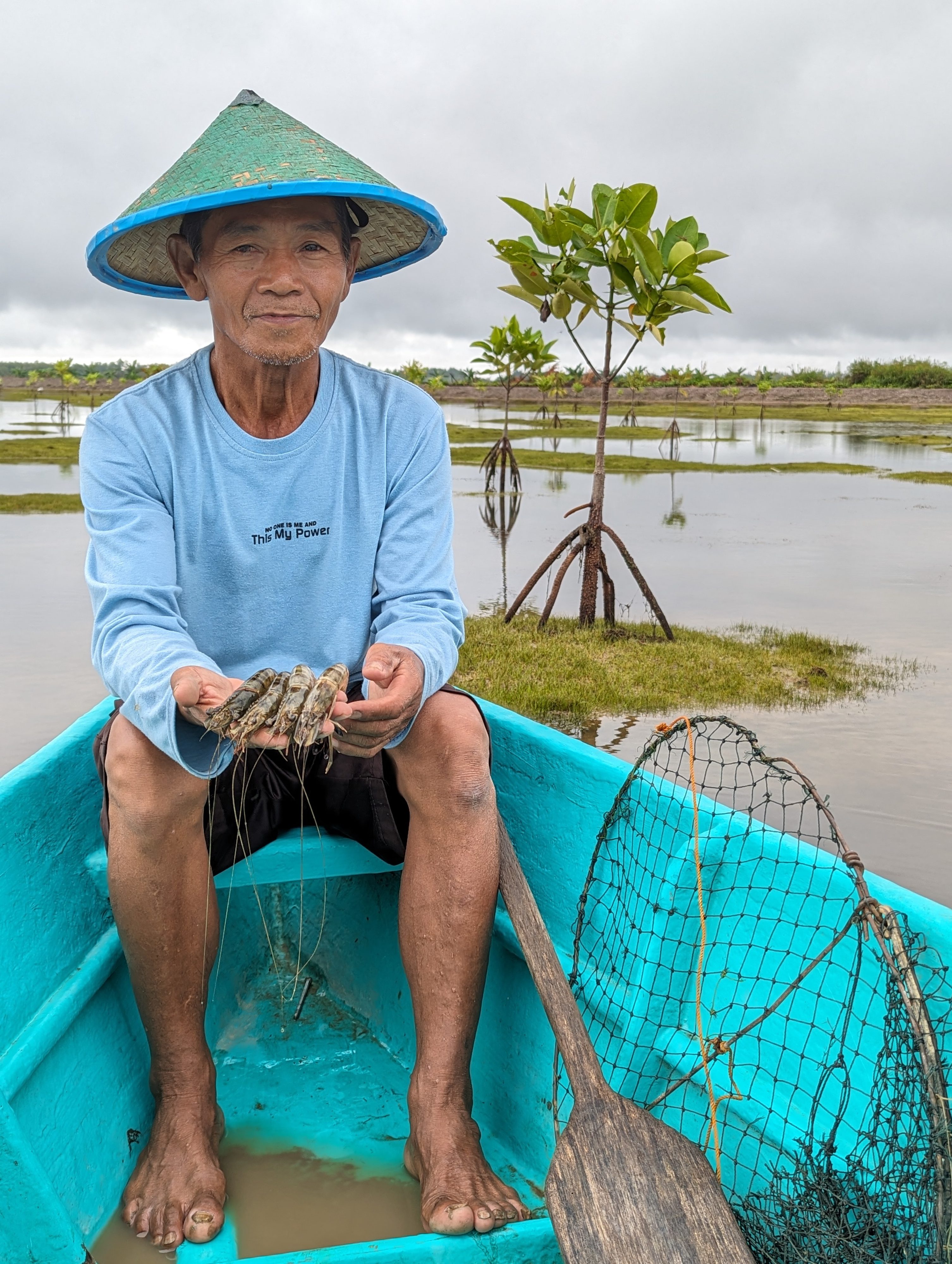 To tackle these challenges, BlueYou is working with farmers to restore the mangroves within active aquaculture ponds to deliver healthy and high quality shrimp. This regenerative, nature-based approach combines mangrove restoration with traditional polyculture, allowing farmers to raise shrimp or fish alongside mangroves in the same ponds, restoring nature while producing high quality seafood. The mangrove roots naturally filter the water, support young fish, crabs and shrimp, and rebuild the food systems farmers rely on. This enables farmers to sustain high-quality seafood production while restoring coastal ecosystems.